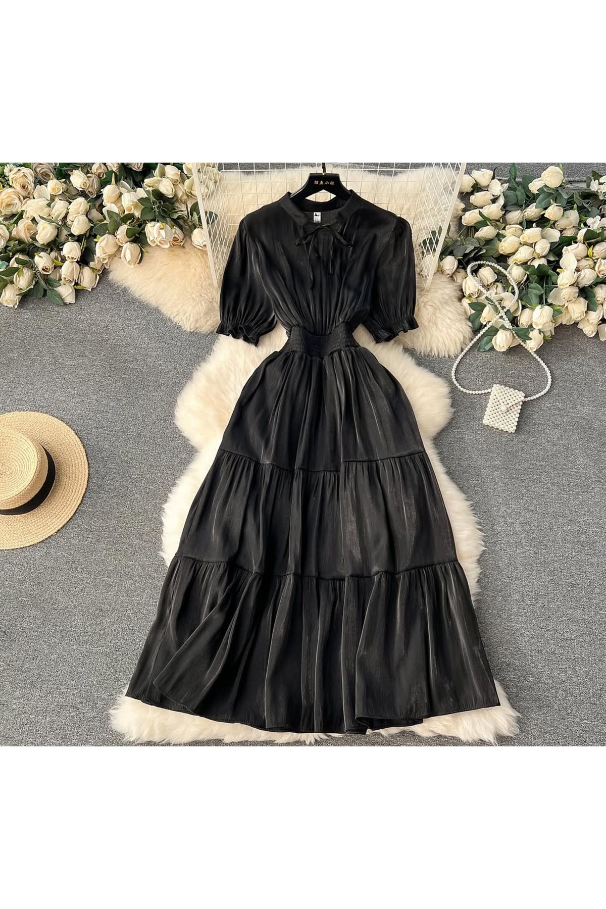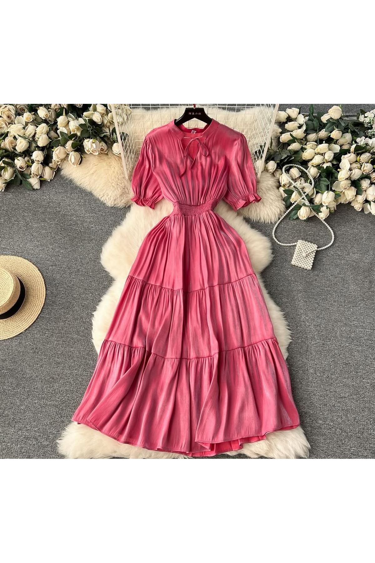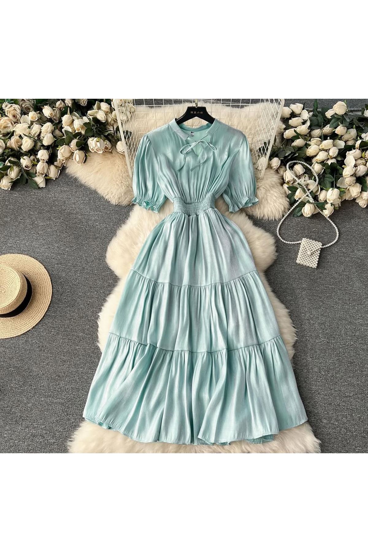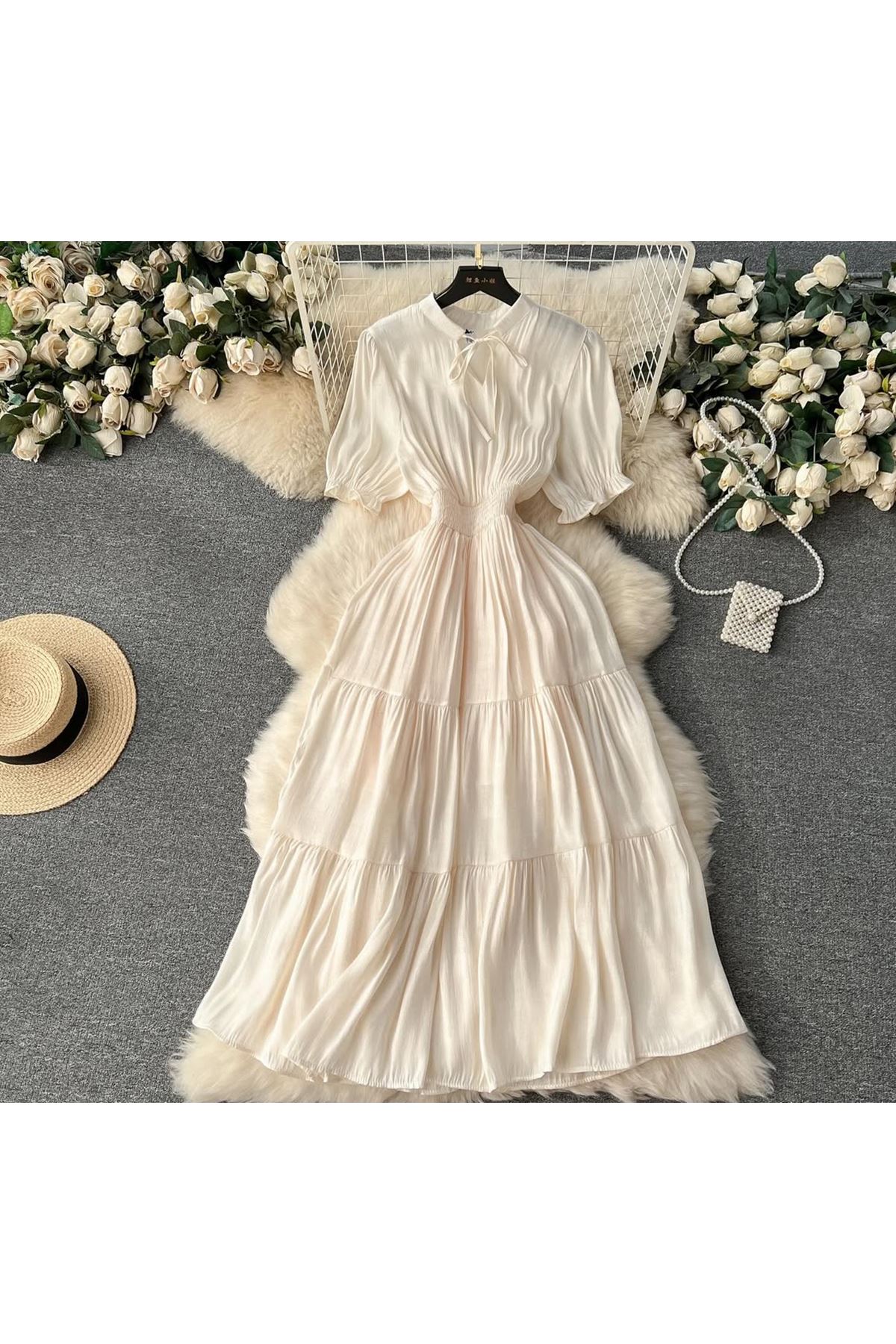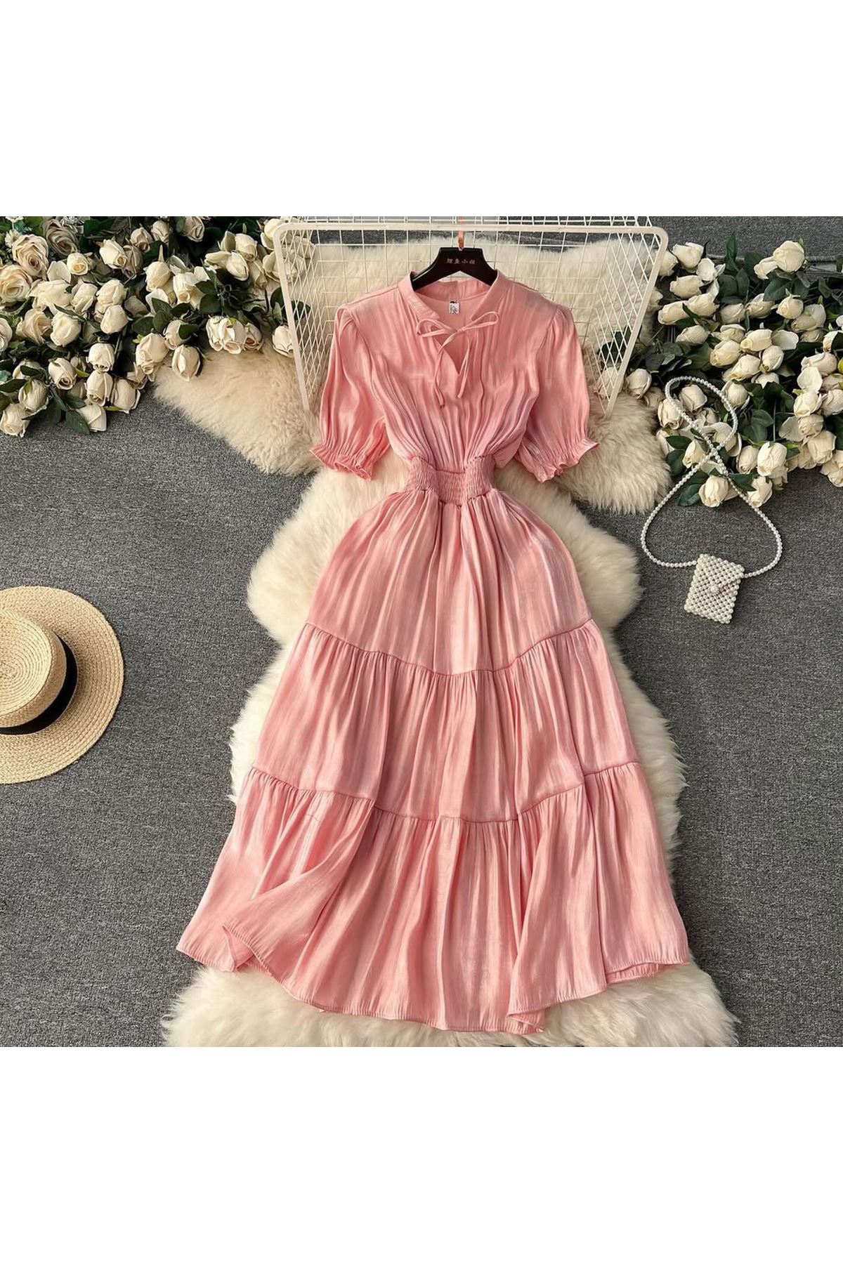 فستان متعدد الطبقات بأكمام منتفخة وفتحة رقبة على شكل حرف V مطرز بالخرز، فساتين كاجوال سادة أنيقة للعطلات، فساتين سادة قابلة للتوصيل المباشر