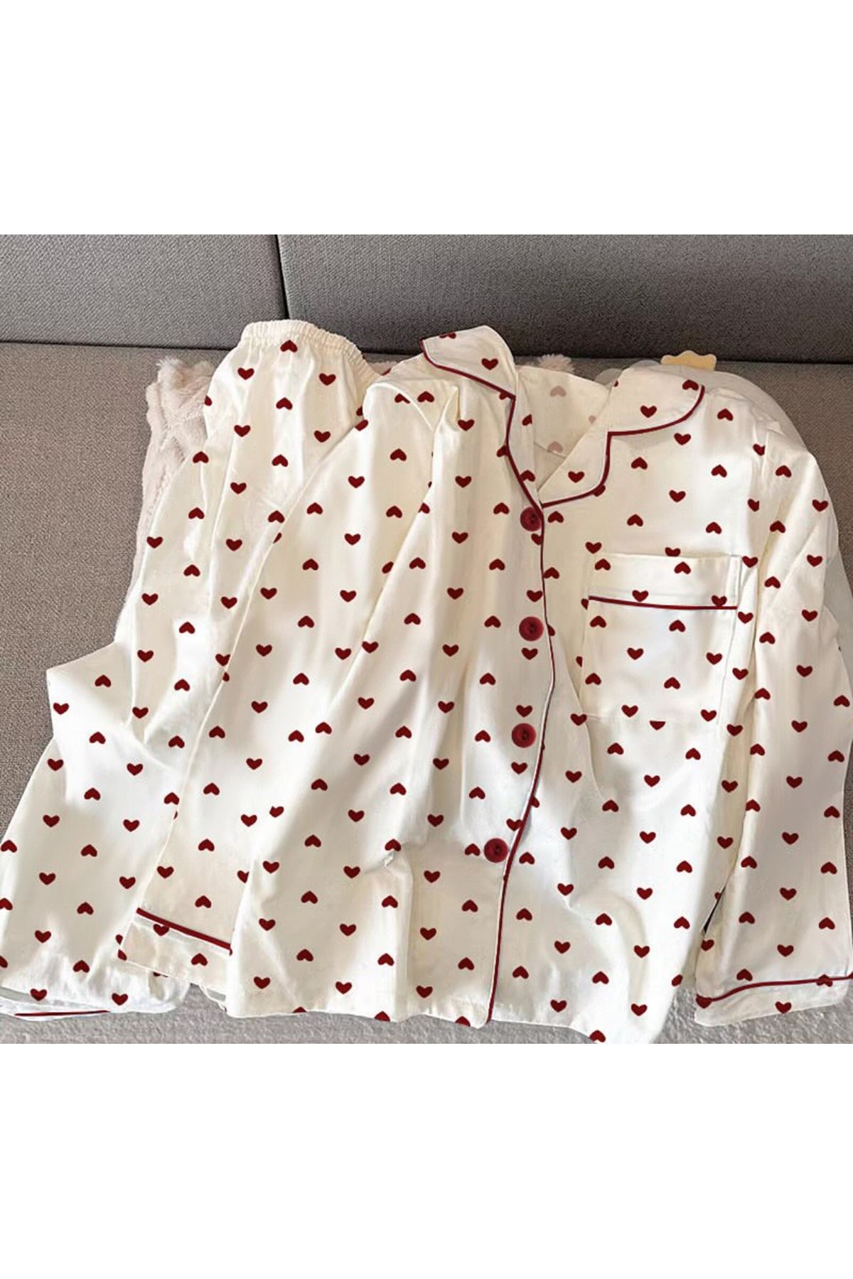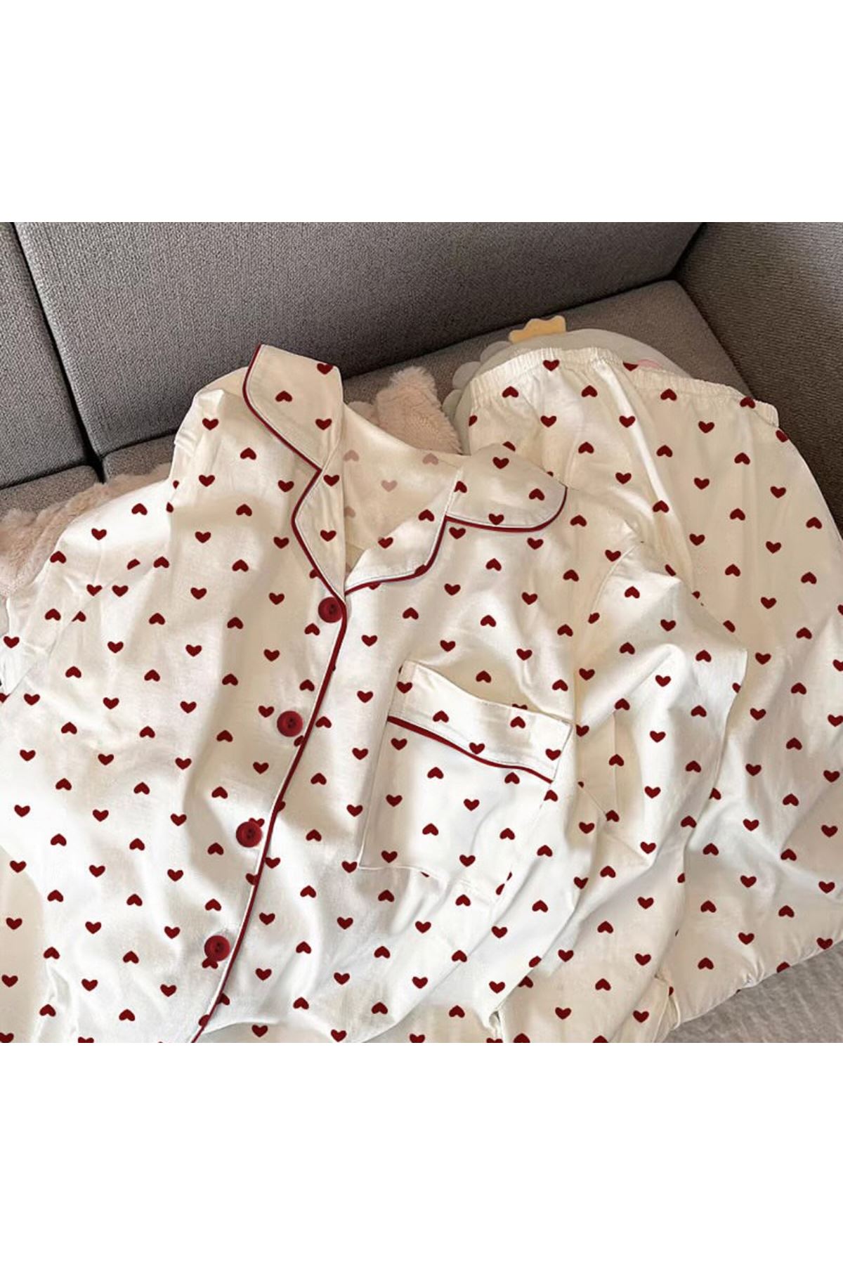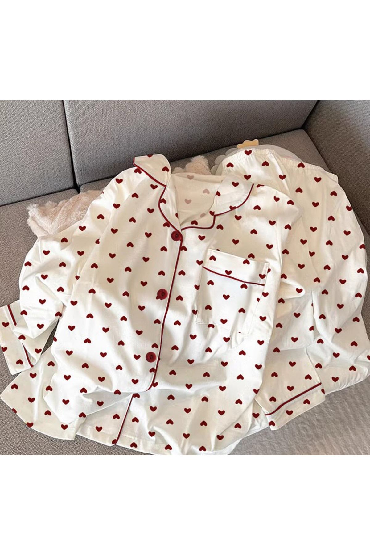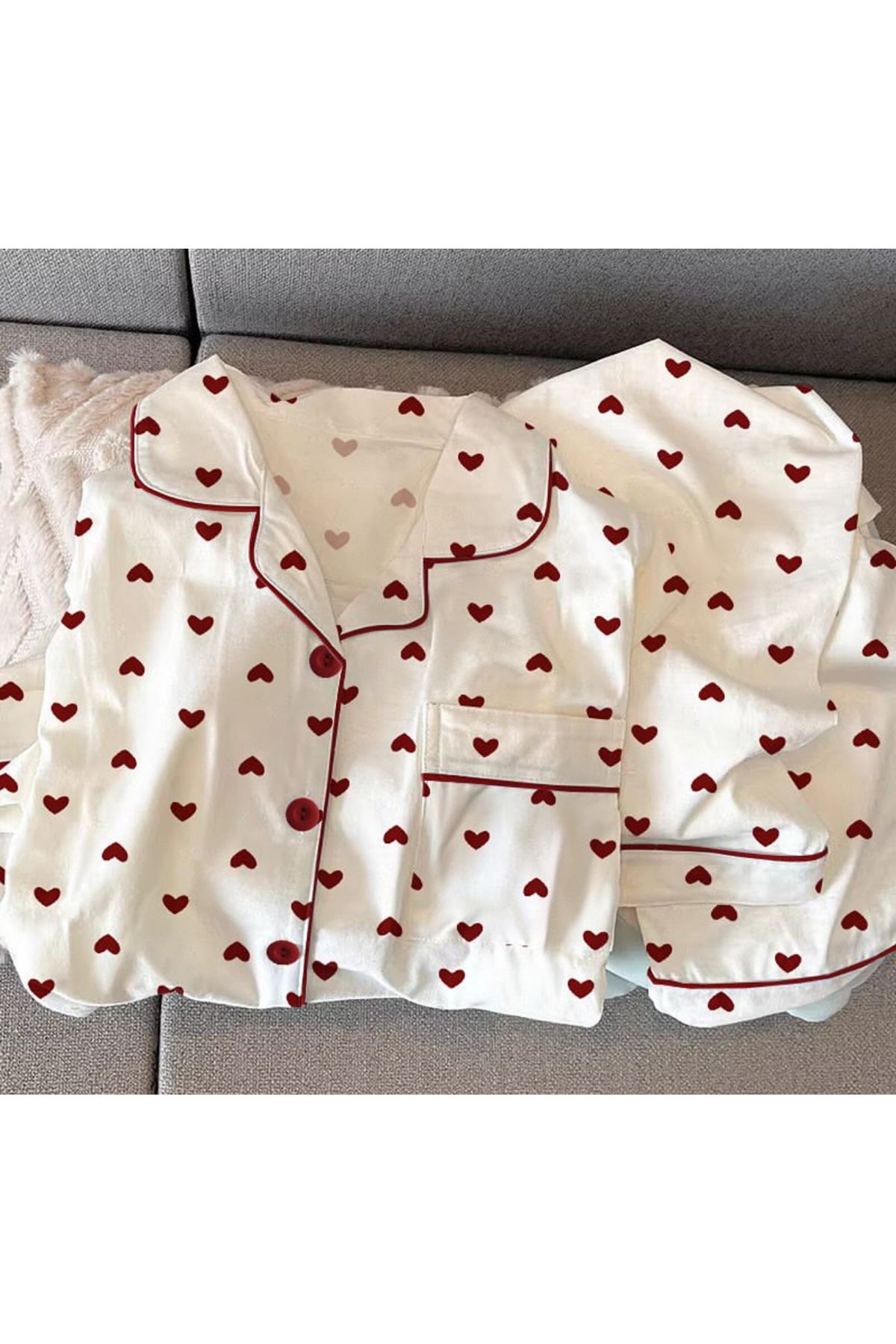 طقم بيجامات نسائي مطبوع عليه قلب، أحذية كورية، بنطلون بأكمام طويلة، طقم من قطعتين، ملابس نوم ربيعية، بدلة منزلية بأزرار