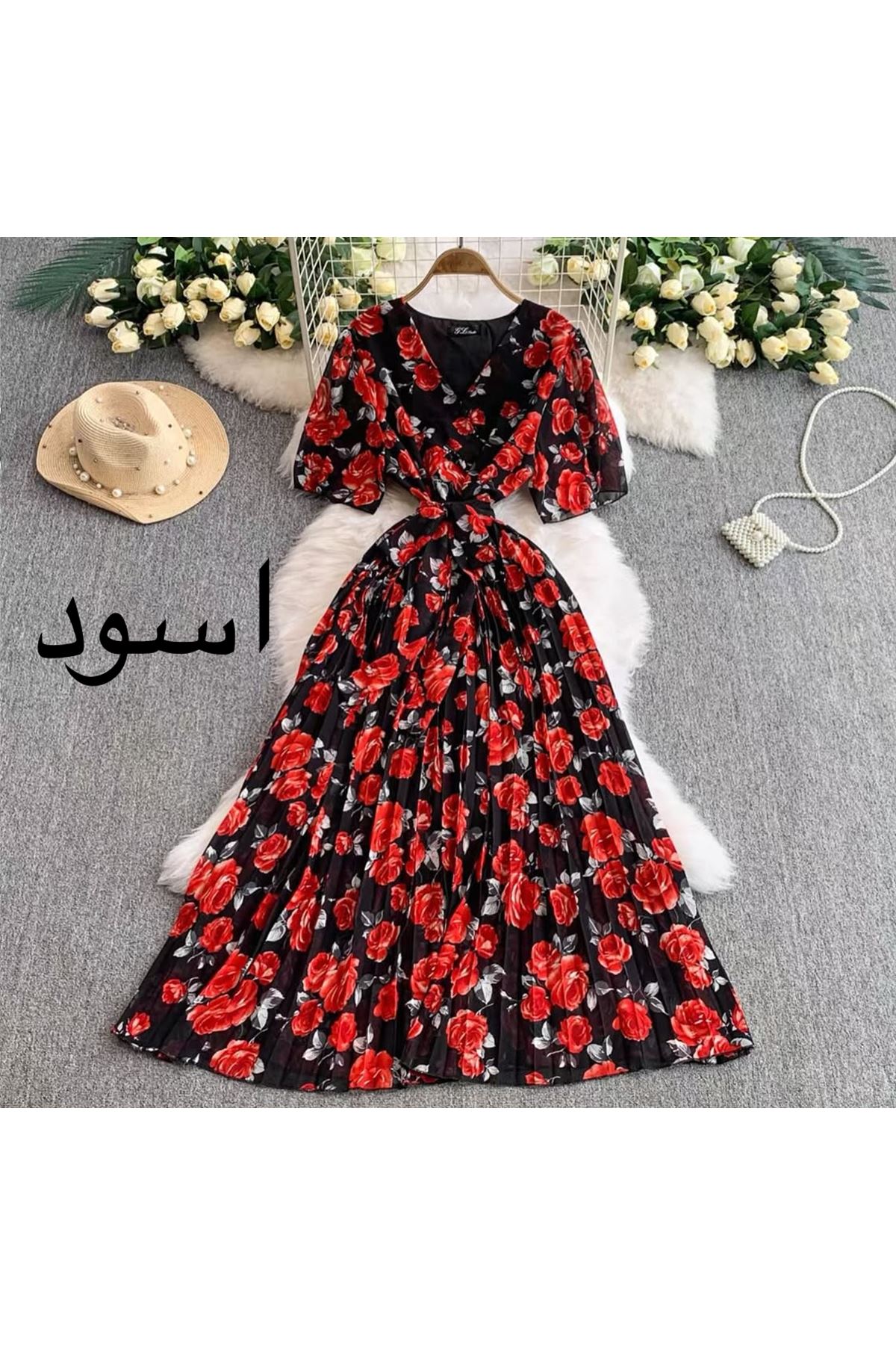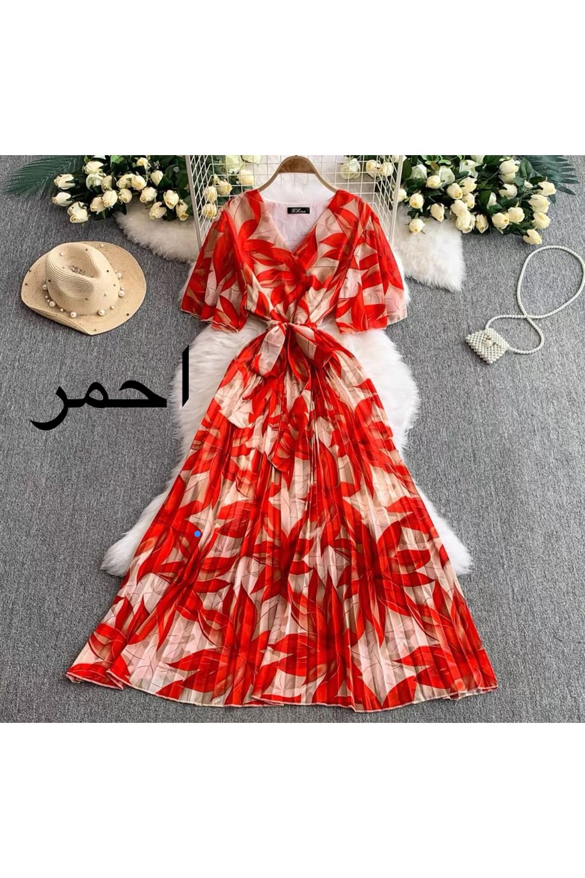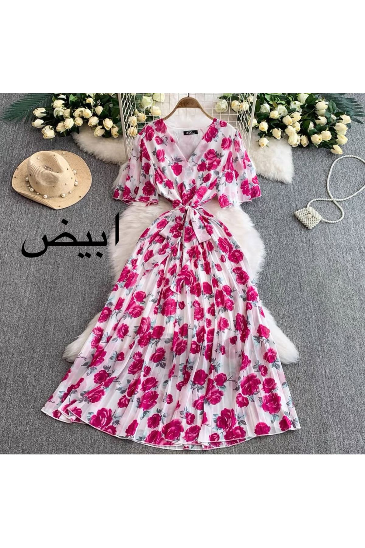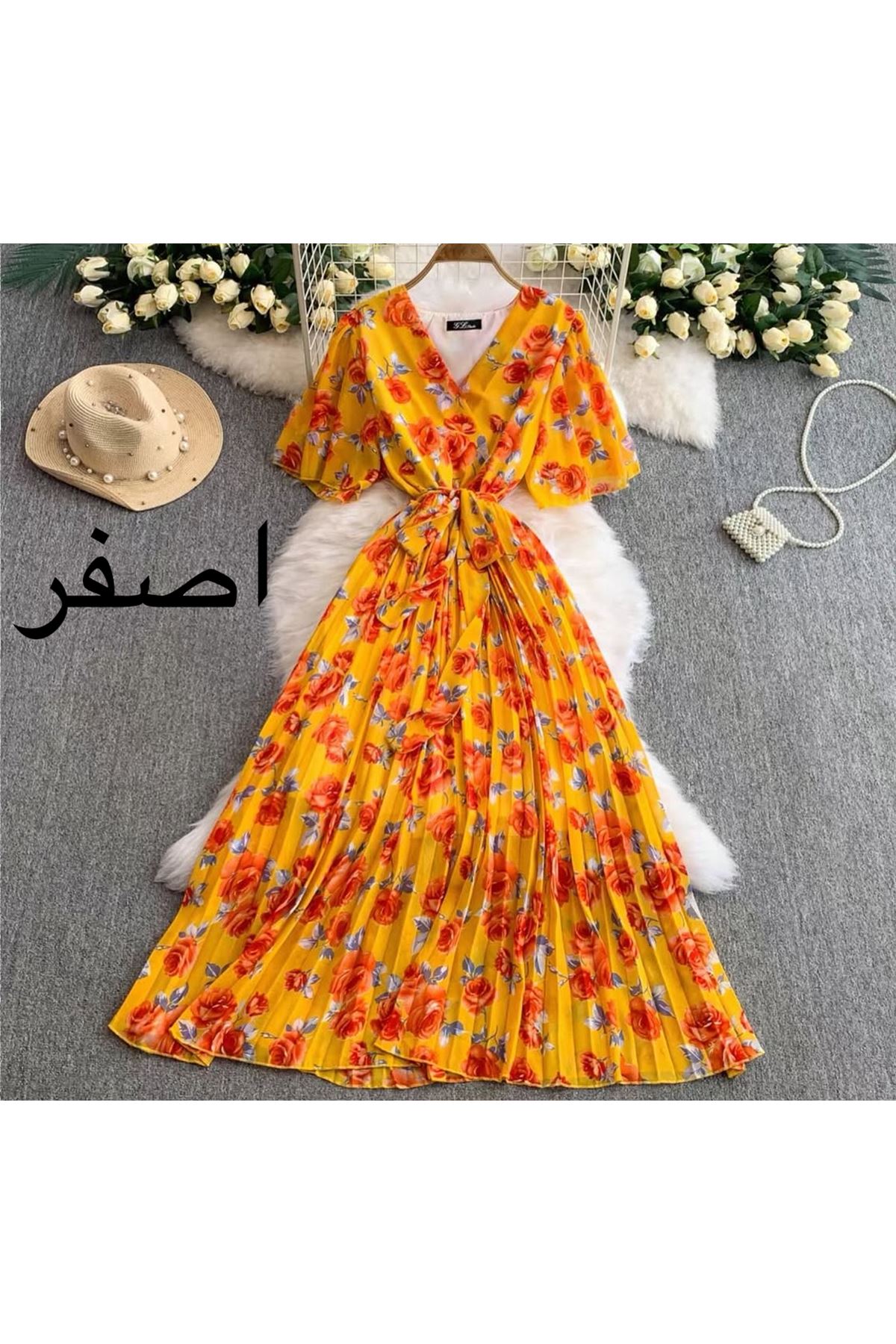 فستان نسائي صيفي كوري أنيق بتصميم بوهو على الشاطئ، بأكمام منتفخة مطوية ورقبة على شكل حرف V، مثير