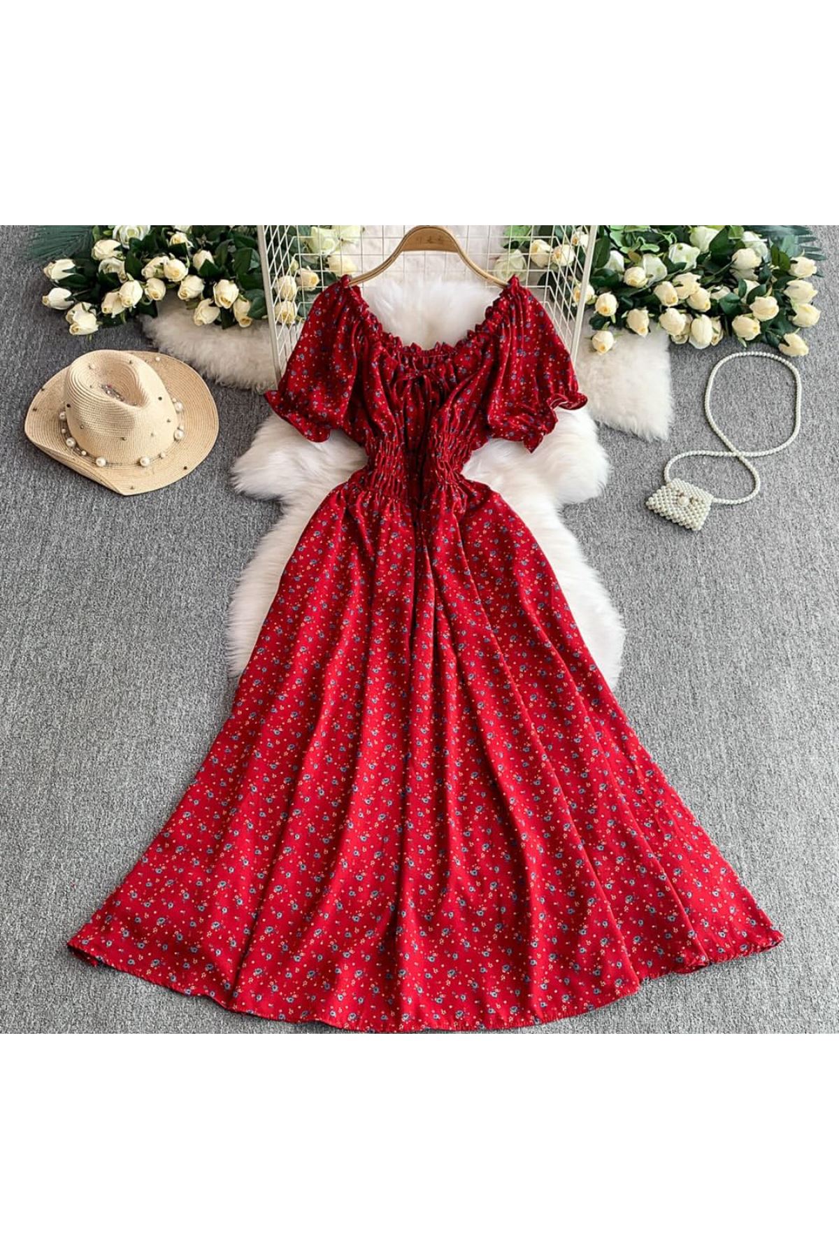 فستان نسائي مطبوع عليه زهور بأكمام منتفخة أنيقة على الشاطئ بتصميم كوري أنيق بياقة مائلة وطويل