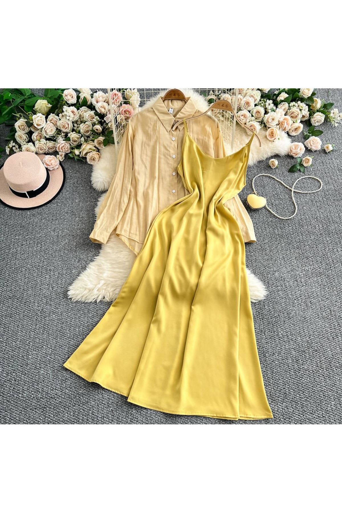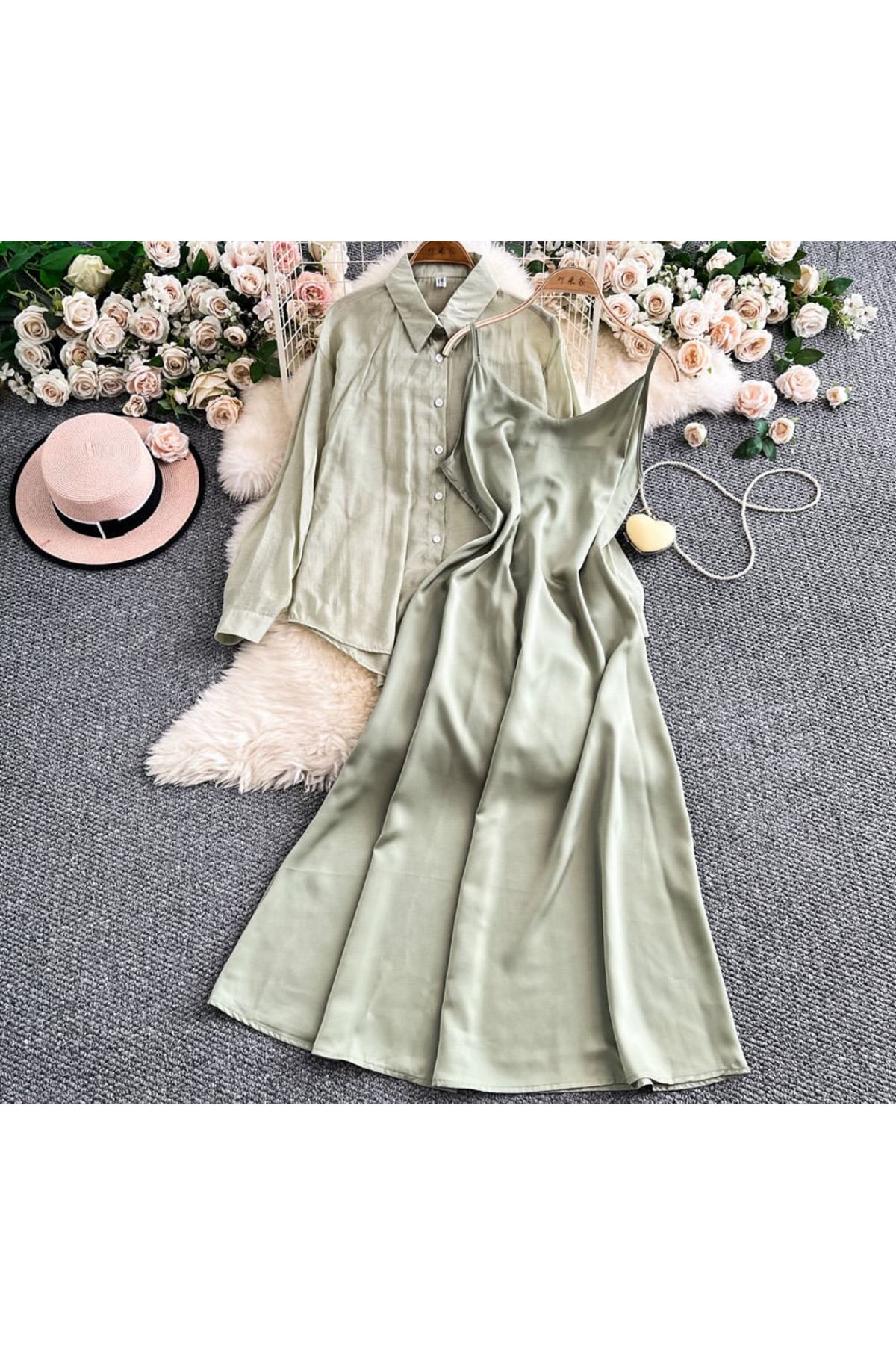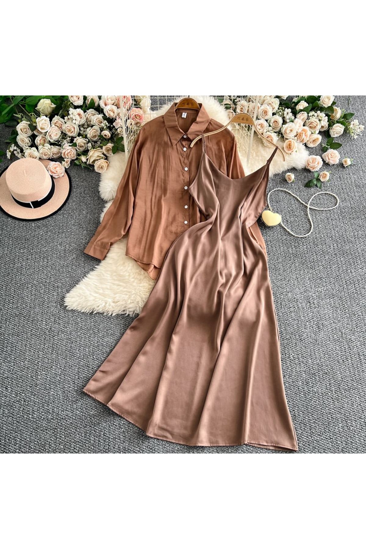 طقم ملابس صيفي مكون من قطعتين للنساء، قميص بأكمام طويلة، فستان ساتان بحزام فضفاض، طقم ملابس كاجوال، ربيع جديد