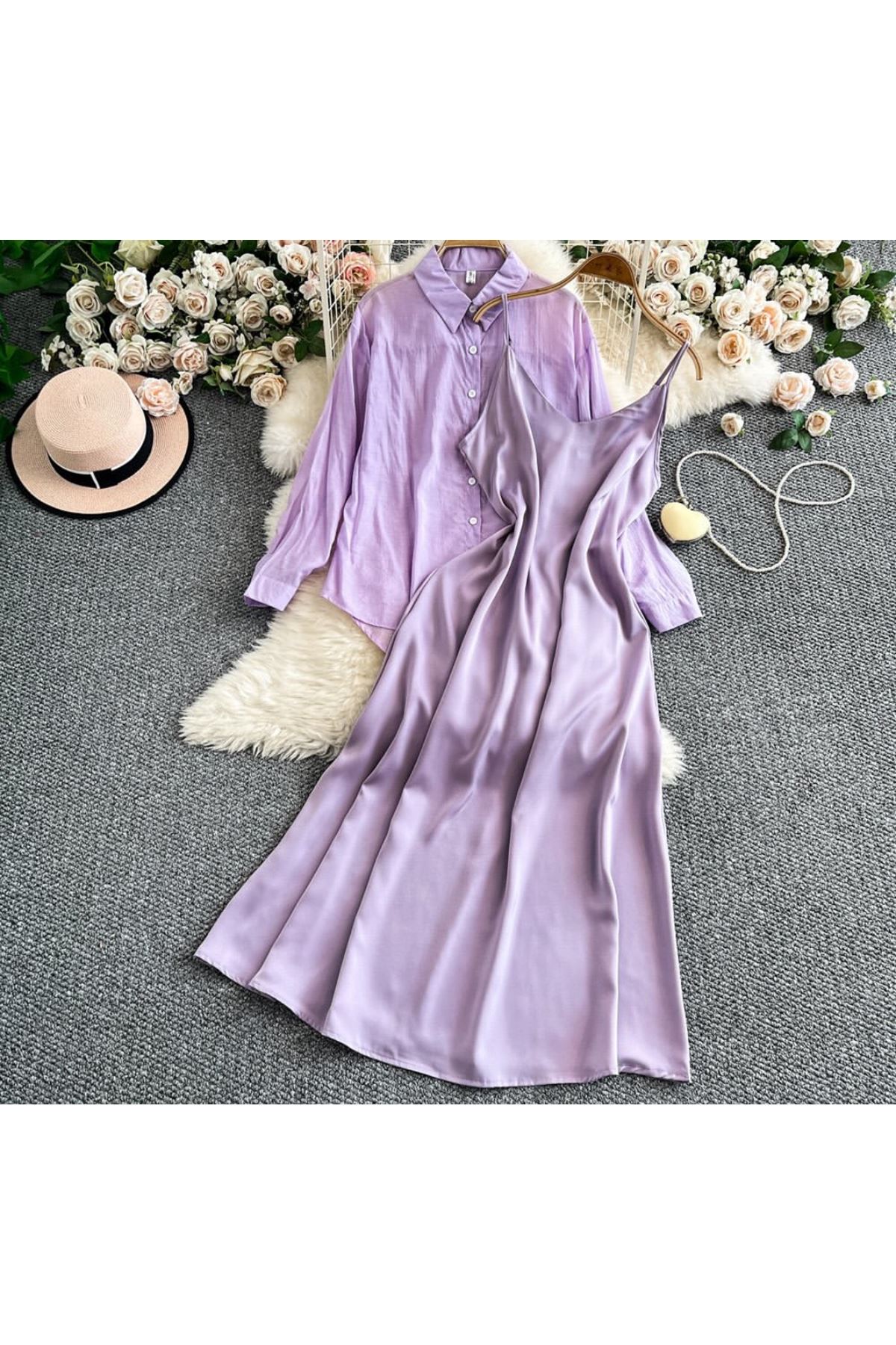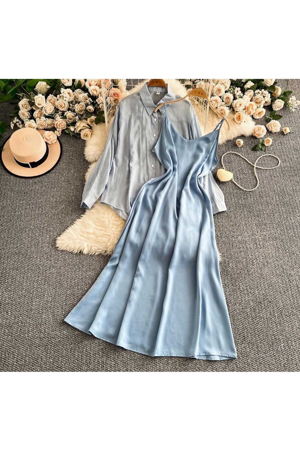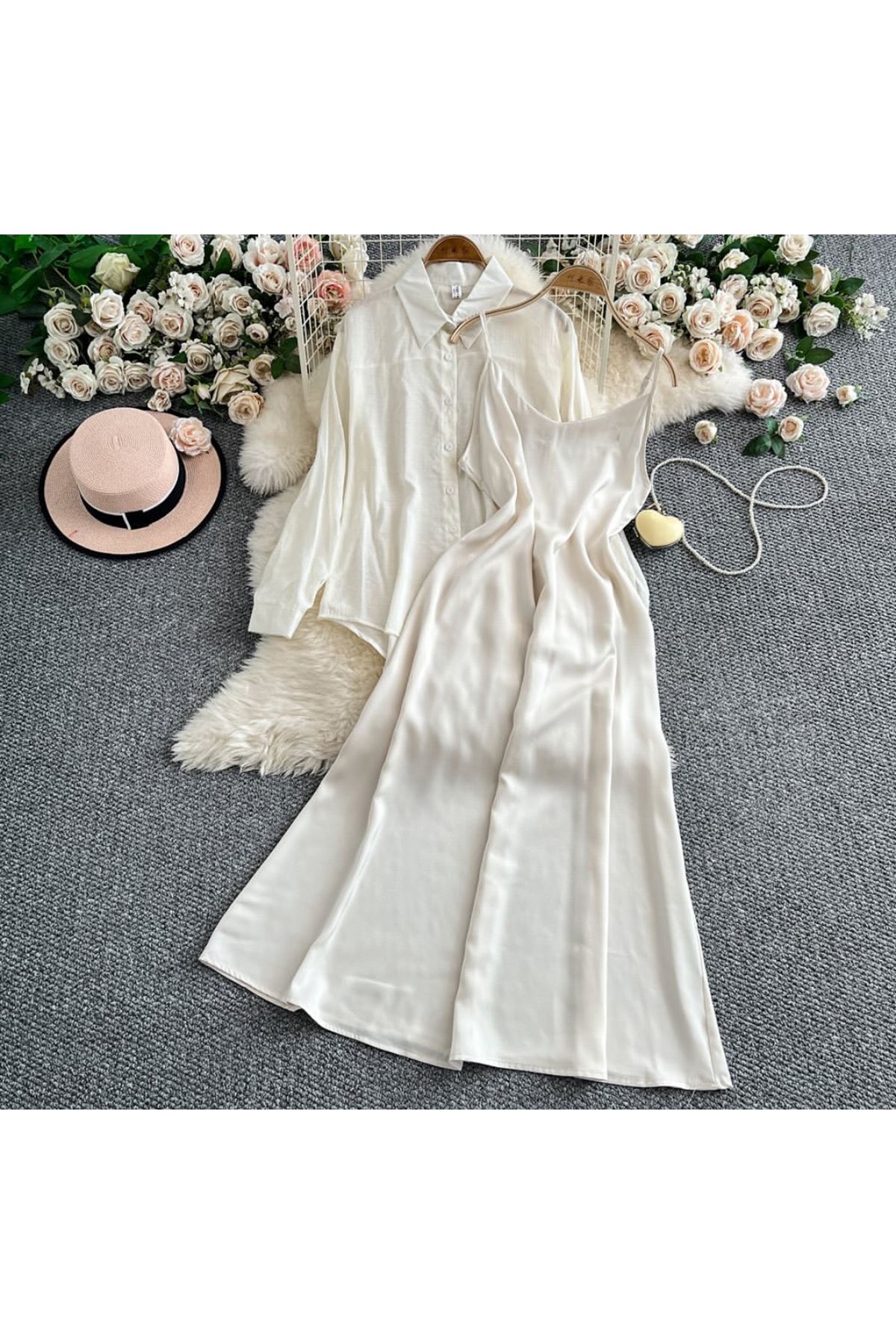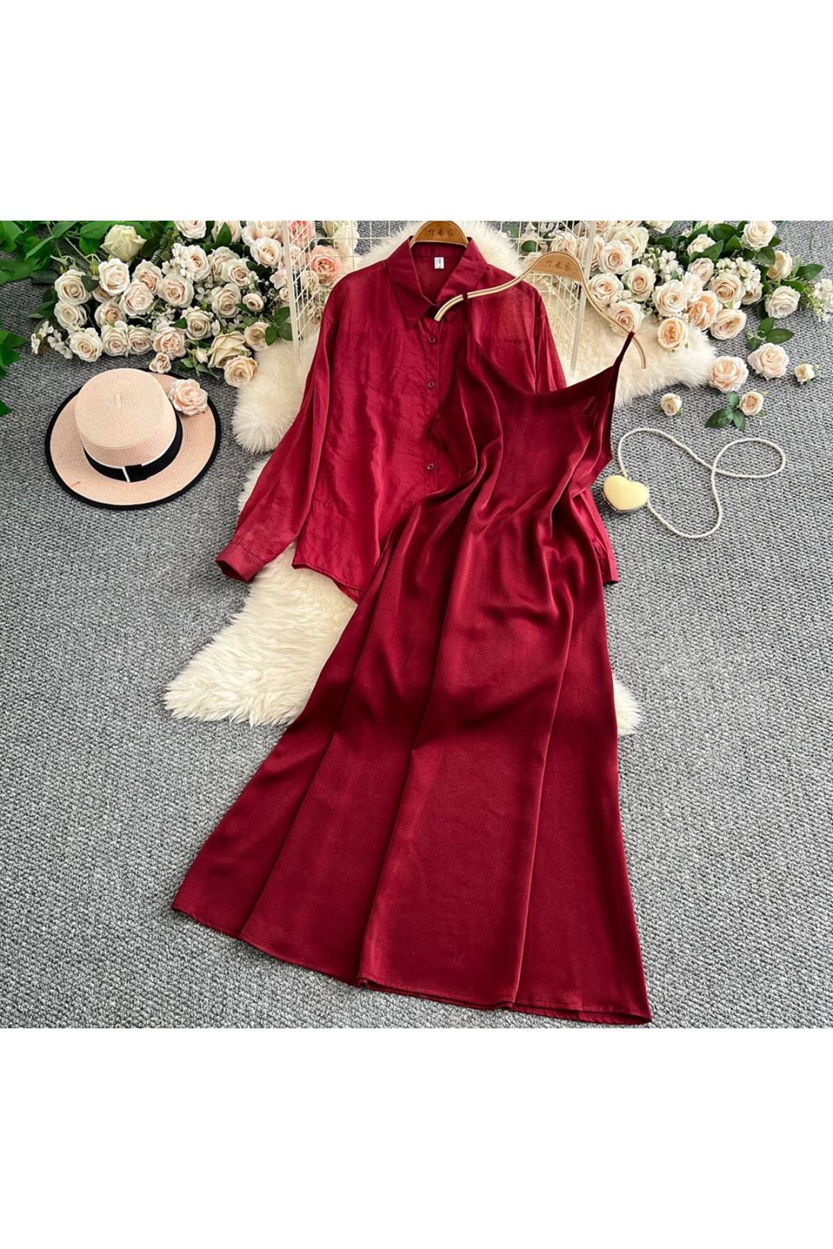طقم ملابس صيفي مكون من قطعتين للنساء، قميص بأكمام طويلة، فستان ساتان بحزام فضفاض، طقم ملابس كاجوال، ربيع جديد