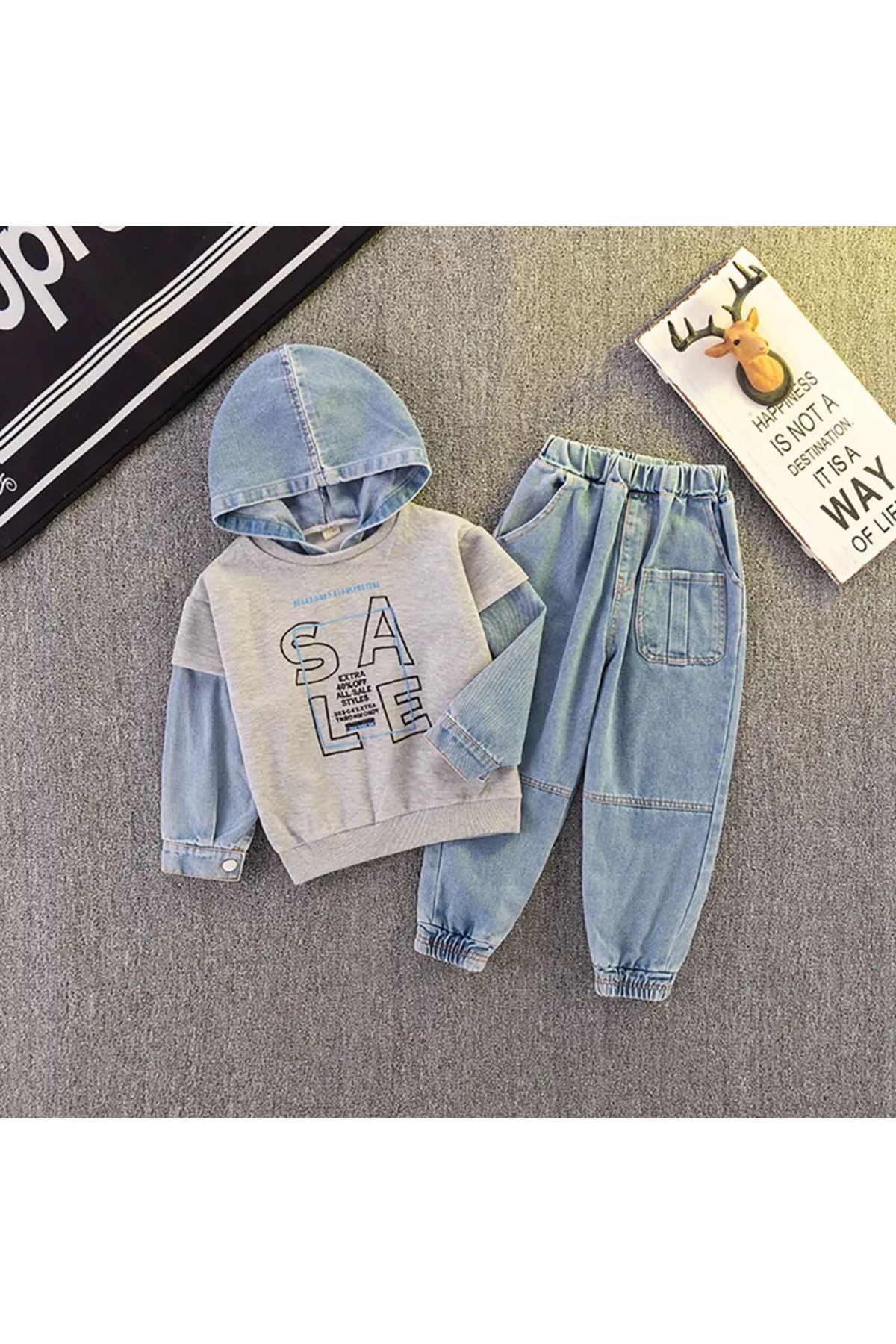أطفال بنين الدنيم الملابس مجموعات عادية وهمية قطعتين قمصان سويت شيرت بقلنسوة + الجينز السراويل 2 قطعة ملابس الأطفال الخريف 🦋🦋
