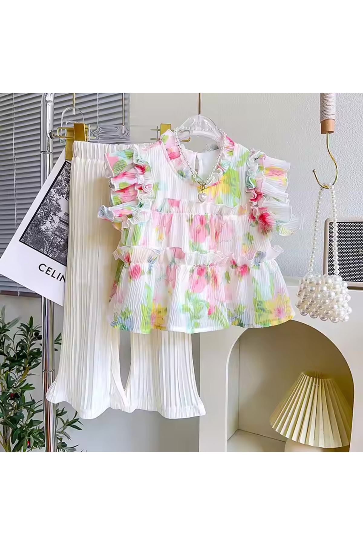 قمصان صيفية مزينة بالزهور للبنات الصغار + بنطلونات مطوية بلوزة بدون أكمام قميص دمية بنطلون قطعتين ملابس