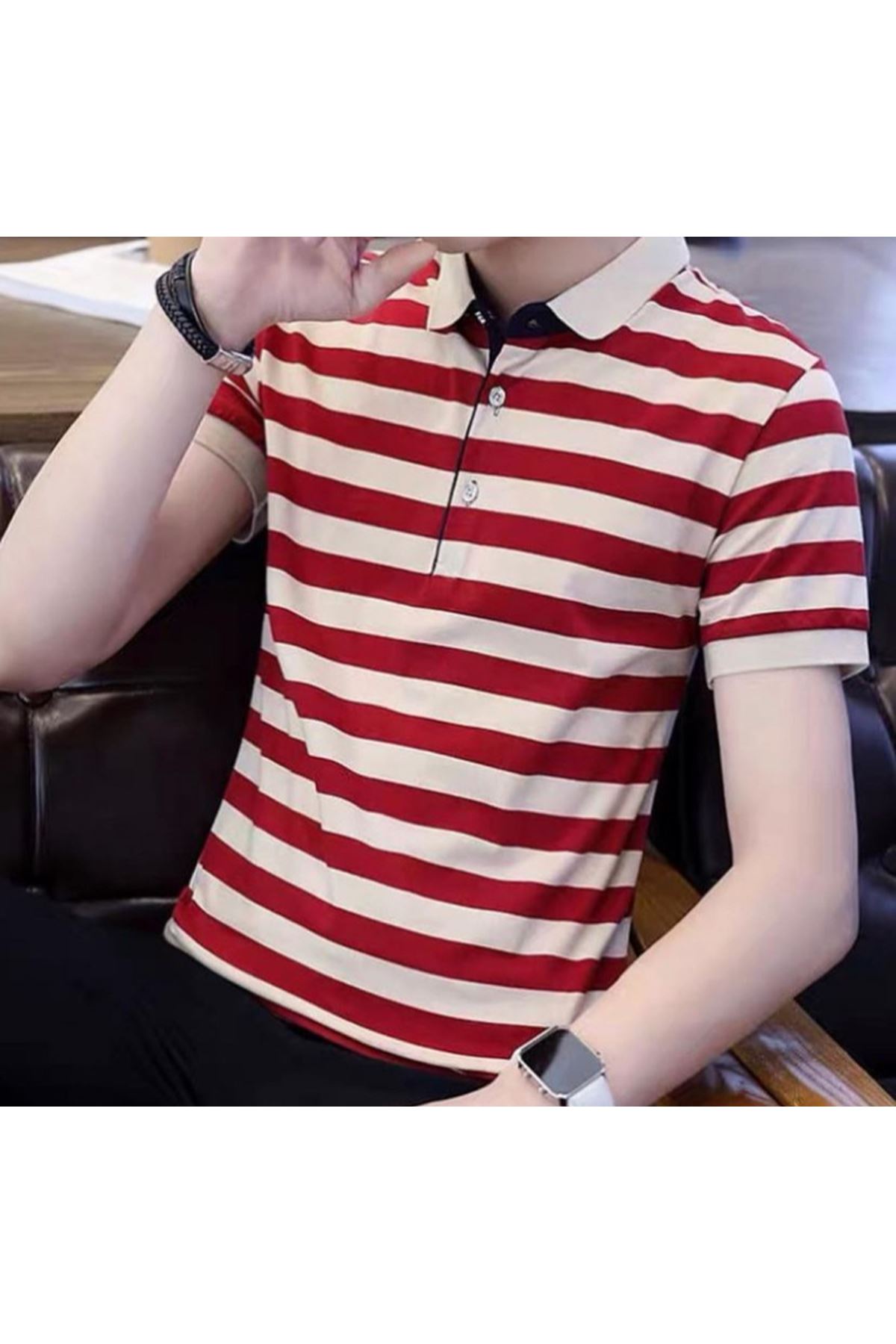 تي شيرت بولو قطن صيفي جديد مخطط موضة أوم قابل للتنفس بأكمام قصيرة وطية صدر السترة للرجال
