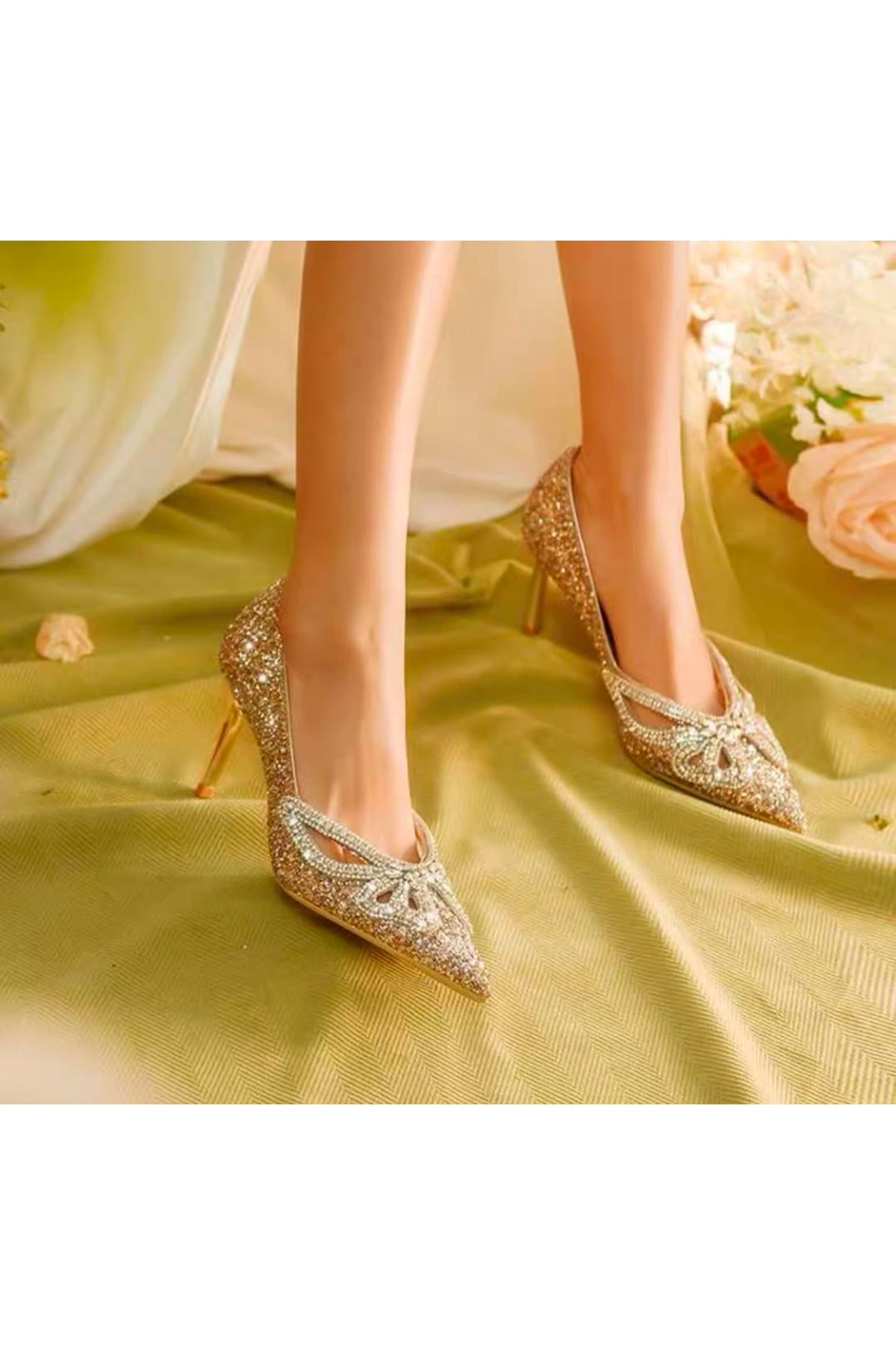حذاء زفاف نسائي مرصع بأحجار الراين حذاء رأس السنة الجديد حذاء نسائي فاخر مزخرف للحفلات بكعب عالٍ ذهبي فضي أحمر
